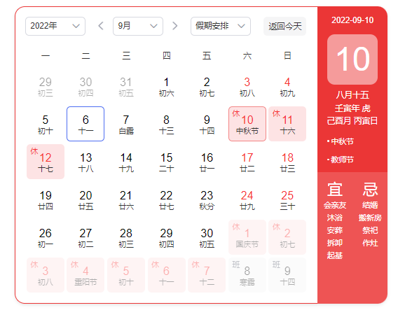 2022年9月10日(周六)放假休息,9月13日(周二)开始恢复上班。