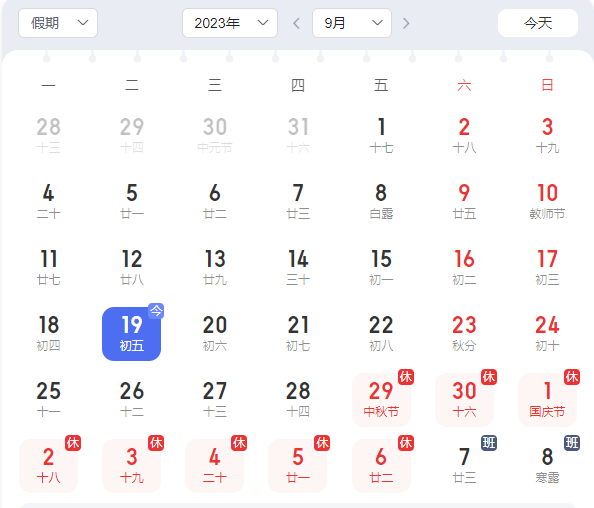 2023年09月29日(周五)放假休息,10月07日(周六)开始恢复上班。