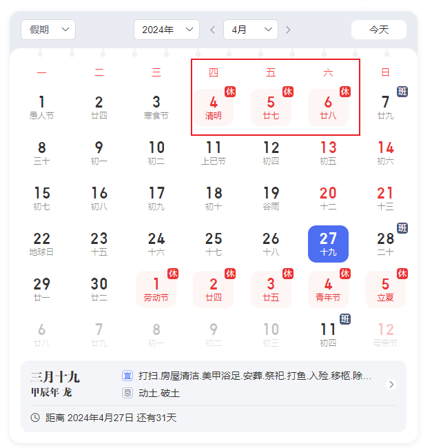 2024年04月04日(周四)放假休息,2024年04月07日(周日)开始恢复上班。