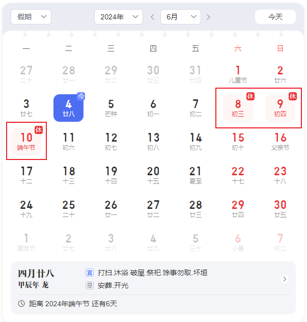 2024年06月08日(周六)放假休息,2024年06月11日(周二)开始恢复上班。