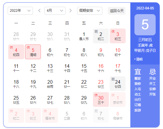 2022年4月3日(周日)至4月5日(周二),4月6日(周三)开始恢复上班。4月2日(周六)补班。